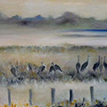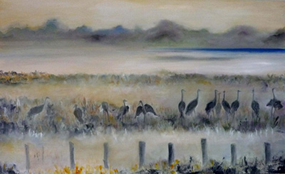 Kraniche im Nebel, 130 x 80 cm